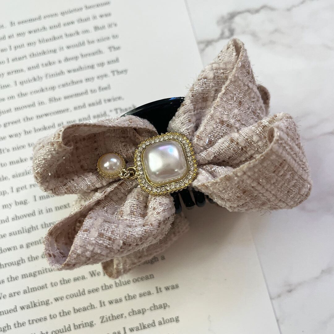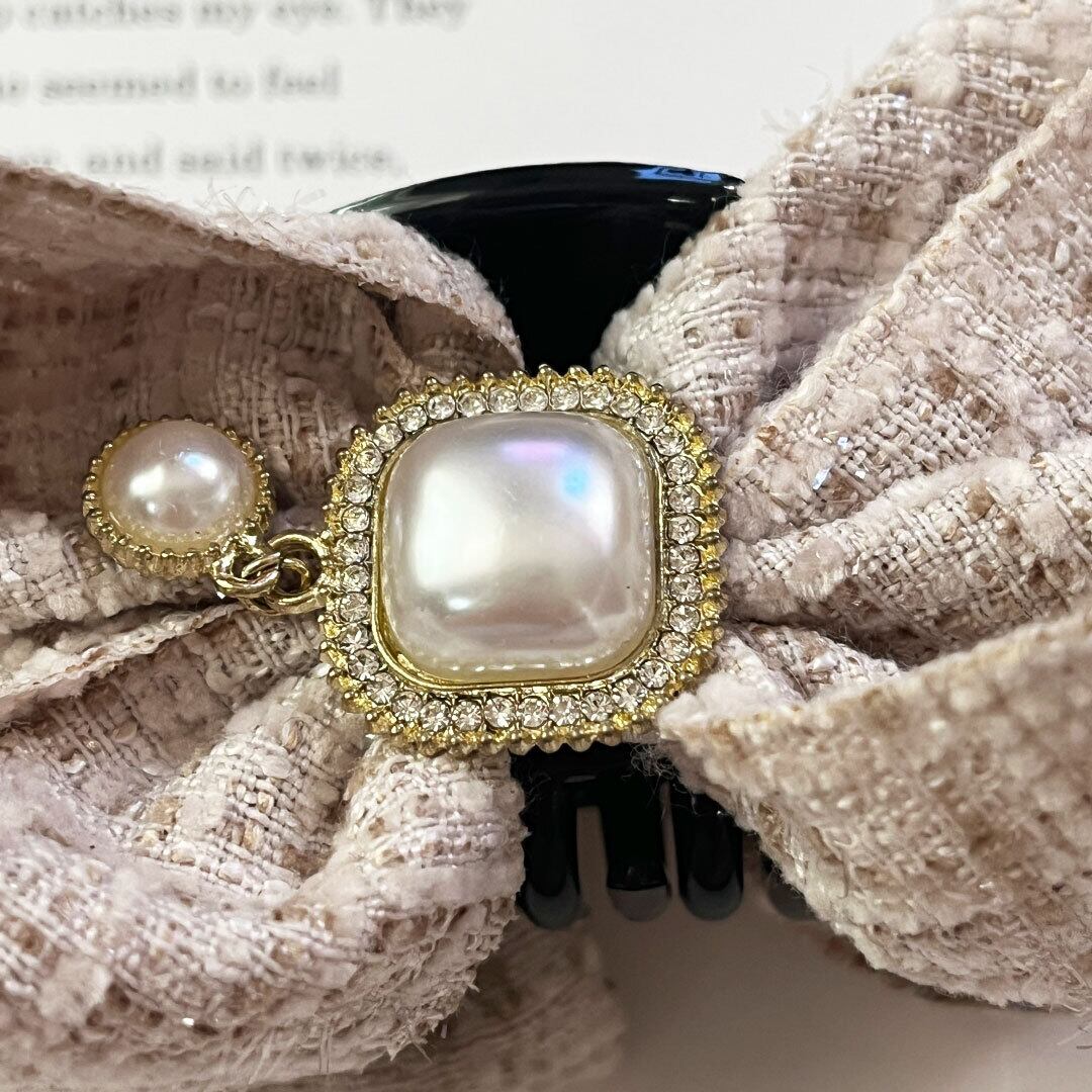 パール付きツイードリボンバンスクリップ レディース ヘアアクセサリー まとめ髪 ヘアアレンジ w-0169
